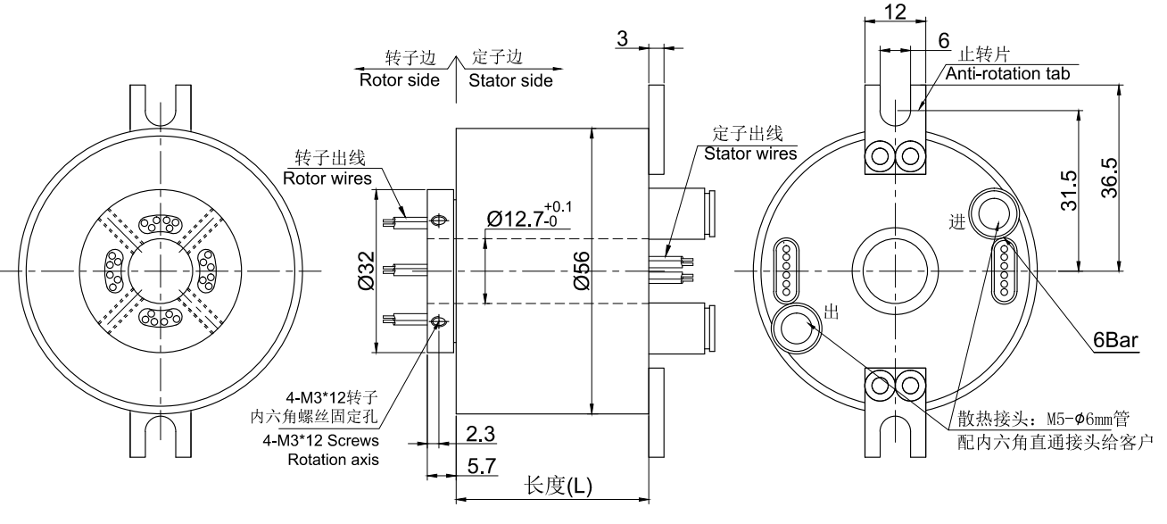 • · 高速过孔导电滑环,整体精密导电滑环,内孔12.7mm,外径56mm,最高转速12000RPM。