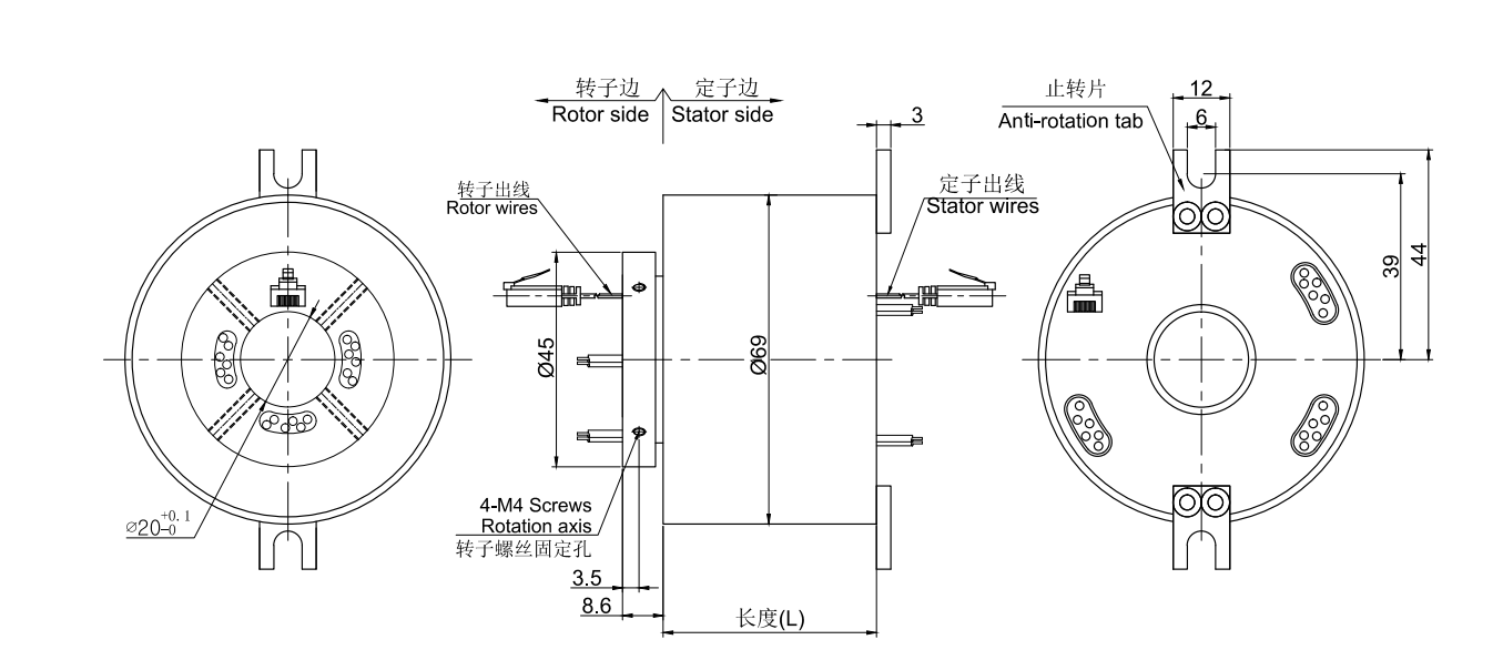 • · ME2201系列1路千兆网线滑环,网线滑环,内孔20mm,外径为标准69mm的紧凑型整体式结构的1通道100M/1000M 以太网整体式精密导电滑环。
