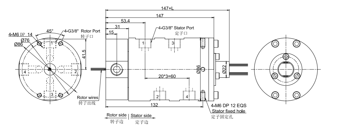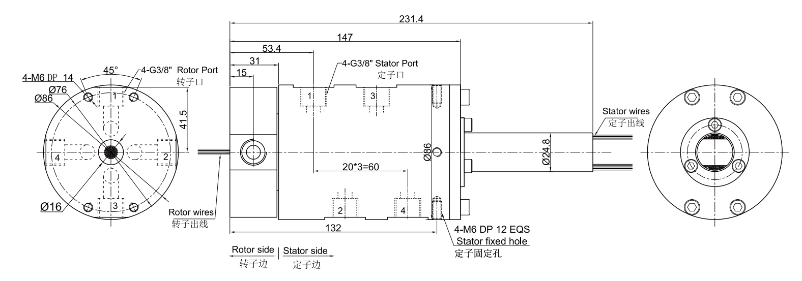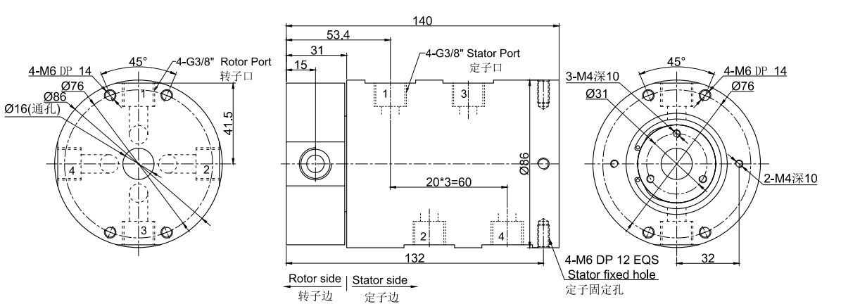 MK43(纯气动旋转接头) 尺寸图 4进4出G3/8"牙